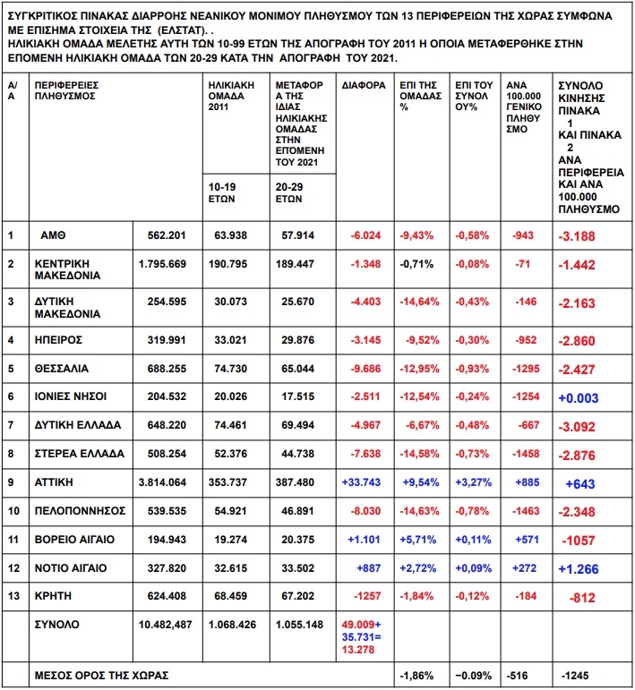2. Μόνο τρεις Περιφέρειες παρουσιάζουν αύξηση: Αττική: +33.743 άτομα Νότιο Αιγαίο: +887 άτομα Βόρειο Αιγαίο: +1.101 άτομα Η υπόλοιπη χώρα όμως υφίσταται δραματική αιμορραγία νεολαίας.