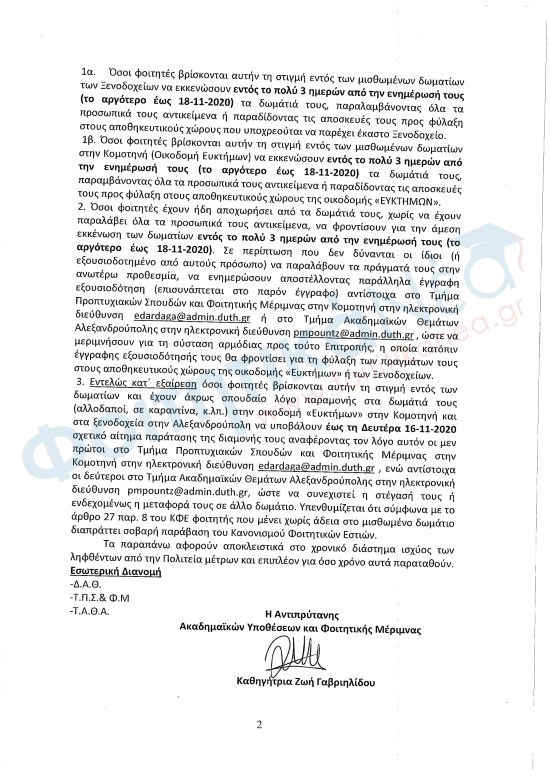 Η διοίκηση του ΔΠΘ ζητά από τους φοιτητές σε Κομοτηνή και Αλεξανδρούπολη να εκκενώσουν τα δωμάτια εστίας εντός 3 ημερών