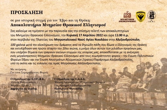 Η Ιερά Μητρόπολη Αλεξανδρούπολης, η Ένωση Πολιτιστικών Φορέων Έβρου (ΕΠΟΦΕ) και η Ένωση Αποστράτων Αξιωματικών Στρατού Έβρου, απευθύνουν ανοιχτή πρόσκληση προς όλους τους πολίτες της Θράκης σε ένα ιστορικό γεγονός - την επίσημη τελετή των αποκαλυπτηρίων του Μνημείου Θρακικού Ελληνισμού, που θα πραγματοποιηθεί την Κυριακή των Βαΐων 17 Απριλίου 2022 και ώρα 11:00 π.μ. στον περίβολο της Πλατείας του Μητροπολιτικού Ναού Αγίου Νικολάου στην Αλεξανδρούπολη.