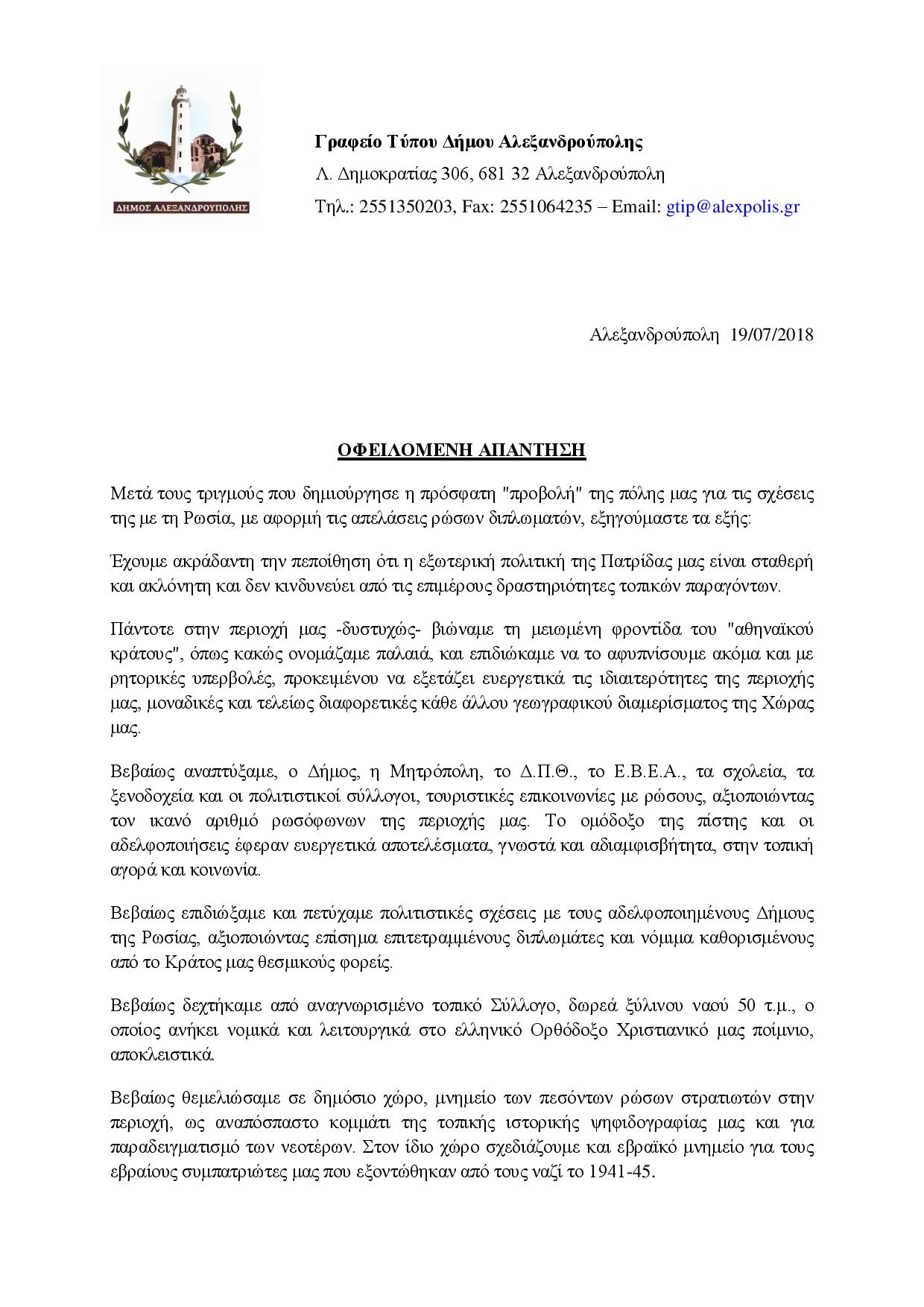 "Μετά τους τριγμούς που δημιούργησε η πρόσφατη "προβολή" της πόλης μας για τις σχέσεις της με τη Ρωσία, με αφορμή τις απελάσεις ρώσων διπλωματών, εξηγούμαστε τα εξής: