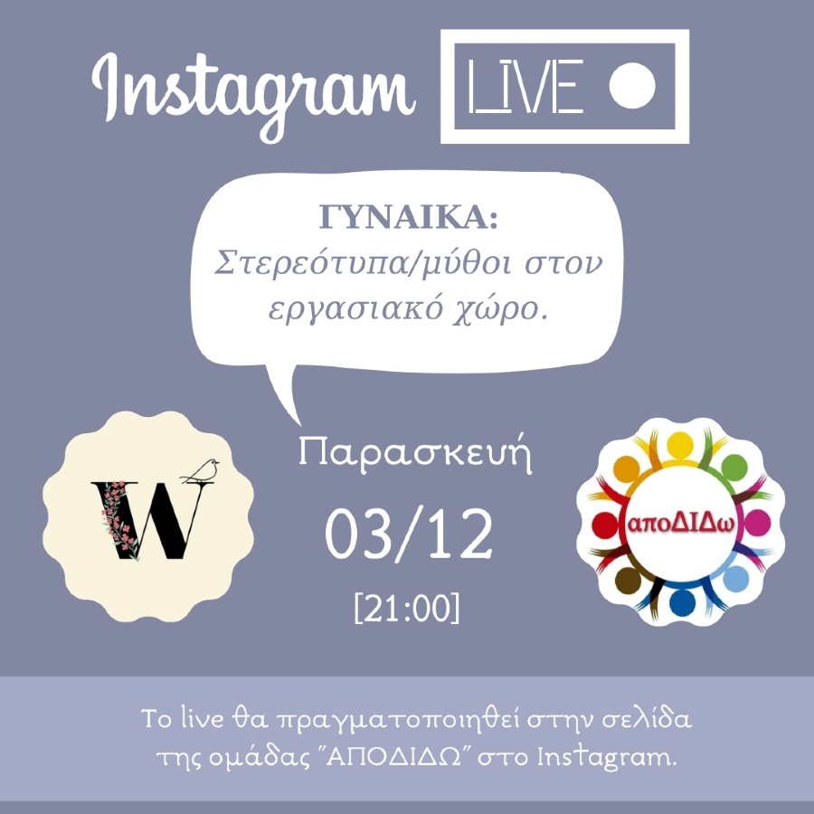 Την Παρασκευή 3 Δεκεμβρίου και ώρα 21:00 η Εθελοντική ομάδα Διδυμοτείχου «αποΔΙΔω» διοργανώνει στο Instagram Live και συγκεκριμένα στον λογαριασμό της @apodidw με θέμα "Γυναίκες: Στερεότυπα & Μύθοι στον εργασιακό χώρο" σε συνεργασία με την σελίδα womenlyofficial.