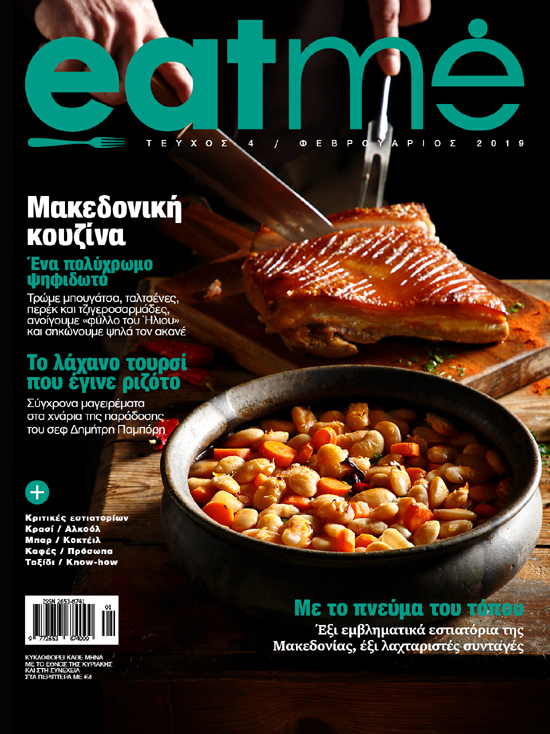 Το τέταρτο τεύχος του eatme είναι αφιερωμένο στη Μακεδονία και τις γεύσεις της. Μια ώσμωση στοιχείων από τις κουζίνες των Βλάχων, των Σαρακατσάνων, των Ελλήνων της Μικράς Ασίας και του Πόντου, αλλά και των γευστικών συνηθειών της αρμένικης και της εβραϊκής κοινότητας, η μακεδονίτικη κουζίνα αποκαλύπτει το πολύχρωμο ψηφιδωτό της. Το αφιέρωμα που διατρέχει το μεγαλύτερο μέρος του τεύχους μεταφέρει μια ζωντανή εικόνα από τα εστιατόρια, τα προϊόντα και τους αμπελώνες της περιοχής. Φωτίζει πρόσωπα και προσπάθειες που διατηρούν την παράδοση του τόπου, αλλά και άλλες που την εξελίσσουν και τη φέρνουν στον 21ο αιώνα.