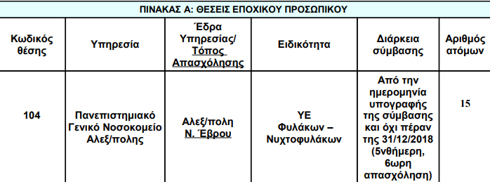 Ανακοινώθηκε η πρόσληψη, με σύμβαση εργασίας ιδιωτικού δικαίου ορισμένου χρόνου, συνολικά δεκαπέντε (15) ατόμων για την αντιμετώπιση απρόβλεπτων ή επειγουσών περιστάσεων του Πανεπιστημιακού Γενικού Νοσοκομείου Έβρου – Νοσηλευτικής Μονάδας: Πανεπιστημιακού Γενικού Νοσοκομείου Αλεξ/πολης, που εδρεύει στην Αλεξανδρούπολη του Νομού Έβρου.