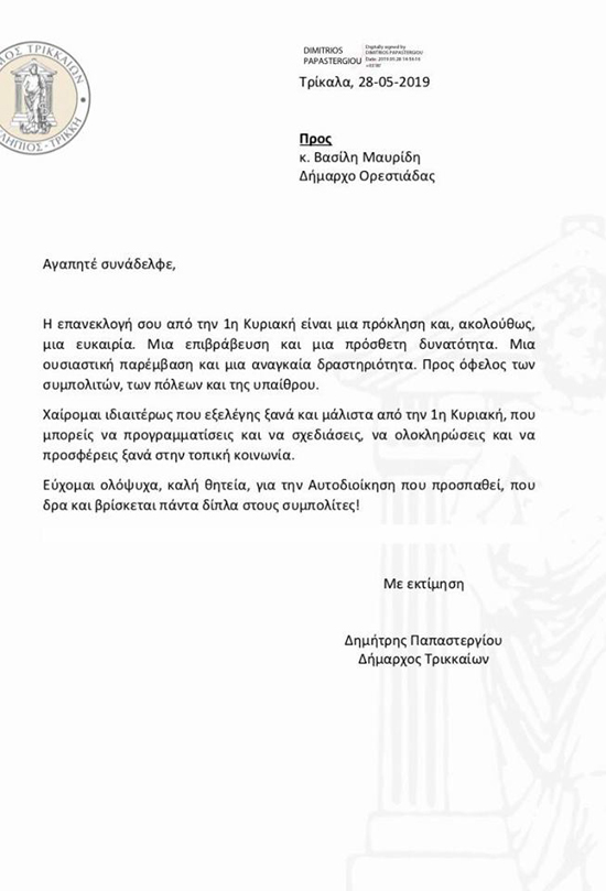 Την ίδια ώρα ο δήμαρχος Ορεστιάδας δέχτηκε επιστολή από τον δήμαρχο Τρικκαίων ο οποίος τον συγχαίρει για την επανεκλογή του.