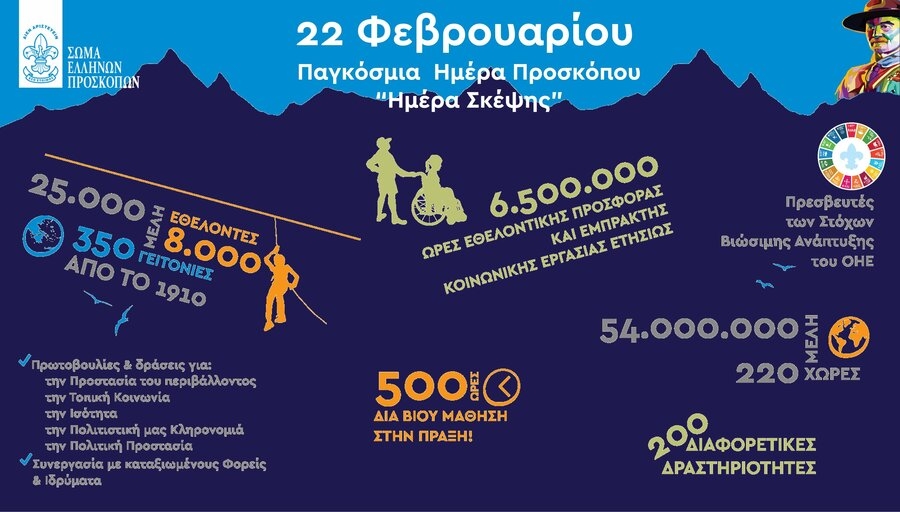 Κάθε χρόνο στις 22 Φεβρουαρίου γιορτάζει η μεγαλύτερη εθελοντική παιδαγωγική κίνηση για νέους σε όλο τον κόσμο: η Προσκοπική Κίνηση! Περισσότερα από 54.000.000 μέλη σε 220 χώρες σε όλο τον κόσμο γιορτάζουν την ημέρα γέννησης του Ιδρυτή της Προσκοπική Κίνησης, Λόρδου Baden-Powell.