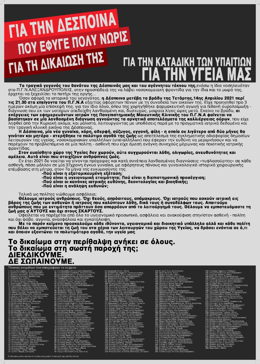 Το τραγικό γεγονός του θανάτου της Δέσποινάς μας και του αγέννητου τέκνου της, ενόσω η ίδια νοσηλευόταν στο Π.Γ.Ν.ΑΛΕΞΑΝΔΡΟΥΠΟΛΗΣ, στην προσπάθειά της να λάβει νοσοκομειακή φροντίδα για την ίδια και το μωρό της, έρχεται να ξεχειλίσει το ποτήρι της οργής…