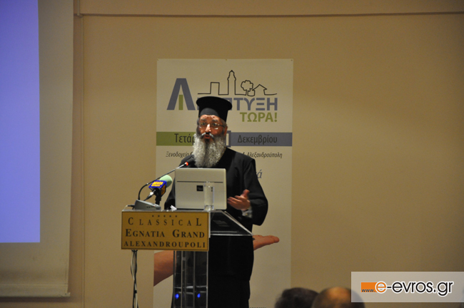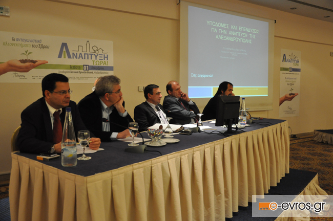 Ο κ. Παπανικολόπουλος Νικόλαος αναφέρθηκε στο τέσσερα έργα που χρονίζουν στην περιοχή μας, το λιμάνι Αλεξανδρούπολης, τον περιφερειακό δακτύλιο Αλεξανδρούπολης, τον αγωγό Μπουργκάς Αλεξανδρούπολη και το έργο χρυσού στο Πέραμα. Ο καθηγητής του τμήματος Διεθνών Οικονομικών Σχέσεων & Ανάπτυξης στο Δημοκρίτειο Πανεπιστήμιο Θράκης κ. Χιόνης Διονύσης, αναφέρθηκε στο «πείραμα» της ελληνικής οικονομίας και στην άμεση ανάγκη για την αλλαγή της κυρίαρχης ιδεολογίας γύρω από την ανάπτυξη.