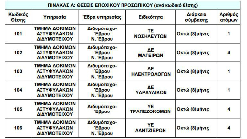 Το Τμήμα Δοκίμων Αστυφυλάκων Διδυμοτείχου που εδρεύει στον Έβρο, ανακοινώνει την πρόσληψη, με σύμβαση εργασίας ιδιωτικού δικαίου ορισμένου χρόνου, συνολικά 15 ατόμων για την κάλυψη εποχικών ή παροδικών αναγκών του.