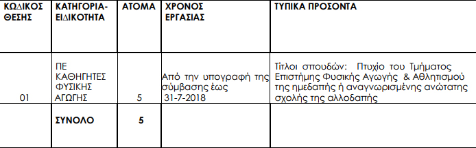 • Να έχουν πτυχίο Π Ε Φυ σ ι κ ή ς Α γ ωγ ή ς Α.Ε.Ι. ημεδαπής ή ισότιμο και αναγνωρισμένο στην Ελλάδα πτυχίο αλλοδαπής α ν τ ί σ τ ο ι χ η ς σχολής και με την ανάλογη ειδικότητα, ή άδεια ασκήσεως επαγγέλματος όπου δεν υπάρχει υποψήφιος με την αντίστοιχη ειδικότητα.