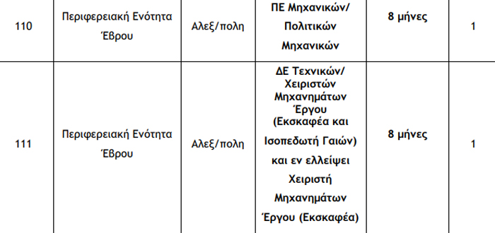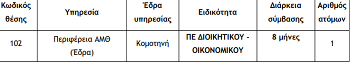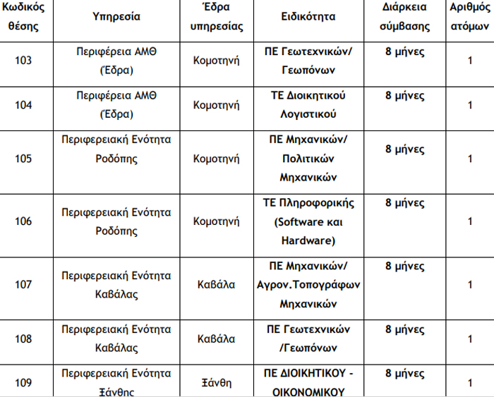 Η Περιφέρεια Ανατολικής Μακεδονίας και Θράκης ανακοινώνει την πρόσληψη, με σύμβαση εργασίας ιδιωτικού δικαίου ορισμένου χρόνου, συνολικά δέκα (10) ατόμων για την κάλυψη αναγκών της Περιφέρειας Ανατολικής Μακεδονίας – Θράκης και των Περιφερειακών Ενοτήτων Ροδόπης, Καβάλας, Ξάνθης, Έβρου και συγκεκριμένα του εξής, ανά υπηρεσία, έδρα, ειδικότητα και διάρκεια σύμβασης.