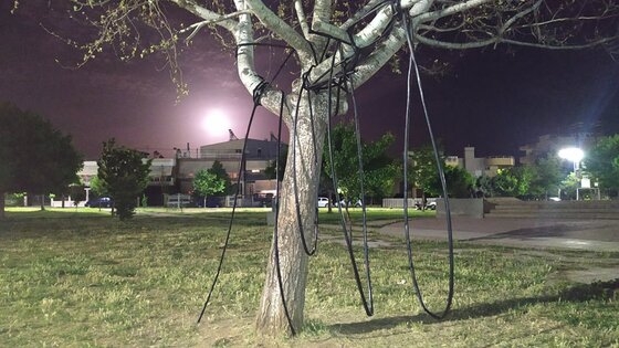 "Πάρκο Ευκλείδη ποιμενιδη 2021. Δεν υπάρχει ούτε μια κούνια να παίξουν τα παιδιά και αναγκάζονται να δένουν λάστιχα σε δέντρα για να παίξουν με κίνδυνο να τραυματιστούν.