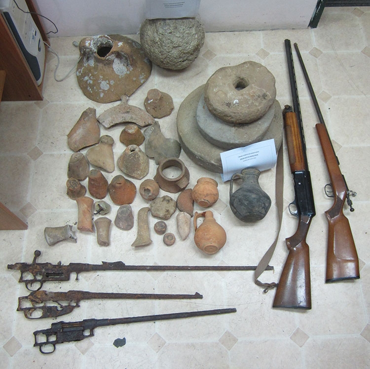 Στο σπίτι του άντρα βρέθηκαν πλήθος αρχαίων αντικειμένων όπως νομίσματα, αγγεία και αμφορείς, αλλά και 2 κυνηγετικά όπλα, 3 κάννες όπλων και 43 αμπούλες μορφίνης.