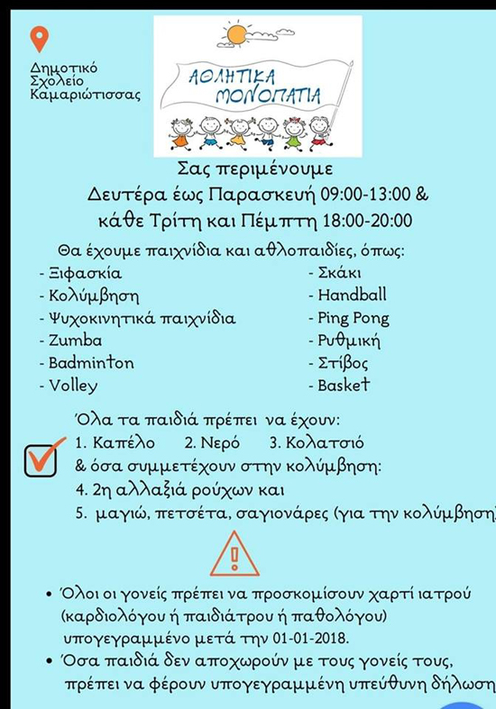 Το πρόγραμμα αθλητικών δραστηριοτήτων απευθύνεται σε παιδιά ηλικίας 6-17 λαμβάνει χώρα καθημερινά, από Δευτέρα έως και Παρασκευή από τις 09:30-13:30 & 18:00-20:00 σε επιλεγμένους χώρους (παραλία & σχολείο) από ομάδα επιλεγμένων επαγγελματιών.