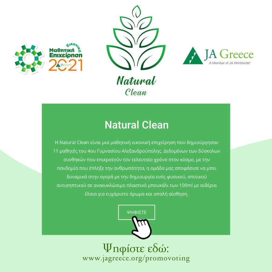 Μαθητές από το 4ο Γυμνάσιο Αλεξανδρούπολης "μπήκαν" αποφασισμένοι στην αγορά εργασίας και δημιούργησαν με επιτυχία το δικό φυσικό, σπιτικό αντισηπτικό με αιθέρια έλαια και δημιούγησαν παράλληλα και διαφημιστικό σποτ της εικονικής επιχείρησης Natural Clean με κύριο στόχο να βγούνε πρώτοι στο διαγωνισμό Καλύτερο Promo Video Μαθητικών Εικονικών Επιχειρήσεων 2021 του Σωματείου Επιχειρηματικότητας Νέων JA Greece.