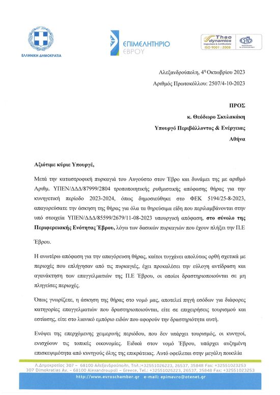 Σημειώνει δε ότι το κυνήγι ως δραστηριότητα ενισχύει σημαντικά την τοπική οικονομία του Έβρου (καταστήματα πώλησης σχετικών ειδών, τουριστικά καταλύματα κα) και ως εκ τούτου ζητά την τροποποίηση της υπουργικής απόφασης εις τρόπον ώστε το κυνήγι να επιτρέπεται σε σημεία του Έβρου που δεν έχουν πληγεί, όπως έχει συμβεί και σε άλλες πυρόπληκτες περιοχές.