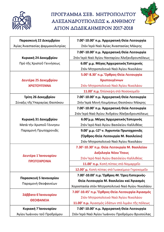 Το πρόγραμμα του Μητροπολίτη Αλεξ/πολεως Άνθιμου για το Άγιο Δωδεκαήμερο 2017-2018