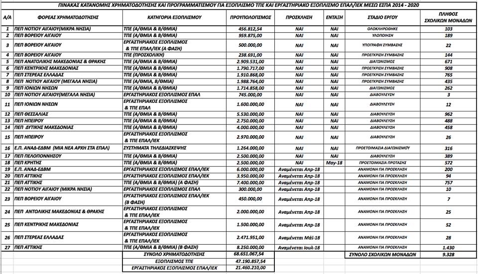 Η Επιτελική Δομή ΕΣΠΑ - Τομέα Παιδείας ανακοινώνει ότι έχουν εξασφαλιστεί χρηματοδοτήσεις ύψους 68.651.000,00€ για προμήθεια και εγκατάσταση εξοπλισμού ΤΠΕ στην εκπαίδευση και προμήθεια και εγκατάσταση εργαστηριακού εξοπλισμού των ΕΠΑΛ και ΙΕΚ. ( Τα 47.191.000,00€ θα διατεθούν για την προμήθεια και εγκατάσταση εξοπλισμού ΤΠΕ στην εκπαίδευση και τα 21.460.000,00€ θα διατεθούν για την προμήθεια και εγκατάσταση εργαστηριακού εξοπλισμού των ΕΠΑΛ και ΙΕΚ).