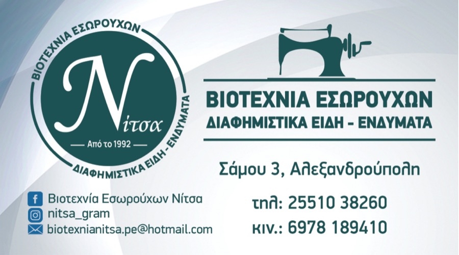 Η Βιοτεχνία Εσωρούχων "Νίτσα", που βρίσκεται επί της Σάμου 3 (google maps) στην Αλεξανδρούπολη, σας προσφέρει: