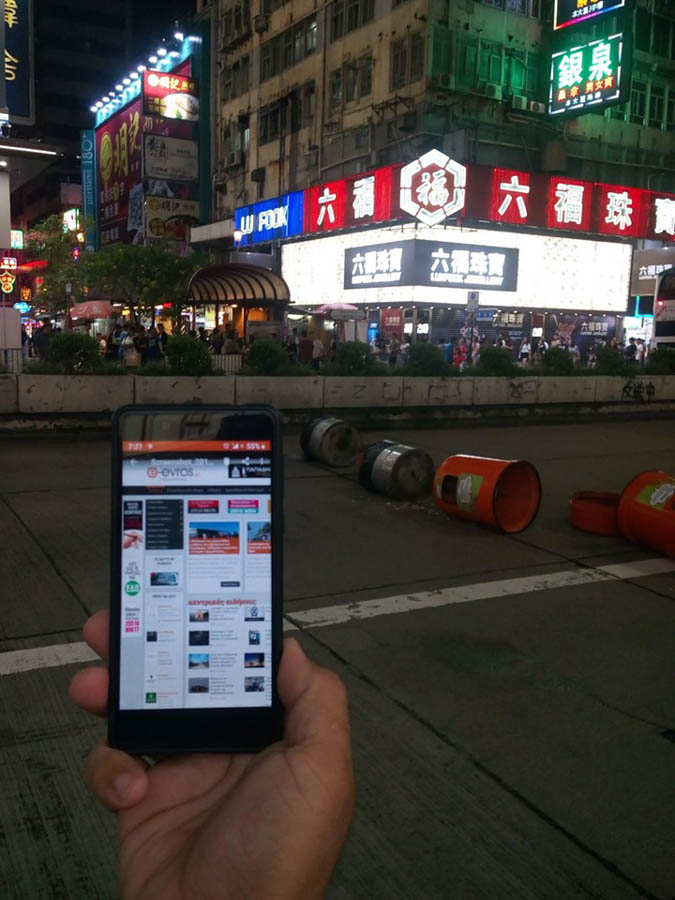 Ο φίλος Γιάννης που βρέθηκε στο Χονγκ Κονγκ μας στέλνει την αγάπη του όχι από κάποιο αξιοθέατο αλλά από το κέντρο όπου έχουν στηθεί οδοφράγματα ενόψει της σημερινής μεγάλης διαδήλωσης