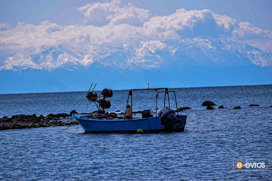 Ένα ψαροκάικο με φόντο το χιονισμένο Σάος της Σαμοθράκης