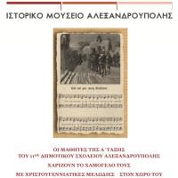 Το Ιστορικό Μουσείο Αλεξανδρούπολης, σε συνεργασία με το 11ο Δημοτικό Σχολείο Αλεξανδρούπολης και τον διευθυντή του σχολείου κ. Κ. Κεραμάρη, την Τετάρτη 23 Δεκεμβρίου στις 12.30 δίνει φως, μουσική και χρώμα στον πεζόδρομο του Ιστορικού Μουσείου με τις χαρούμενες φωνές...