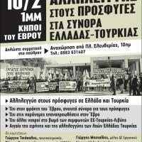 Συγκέντρωση αλληλεγγύης στους πρόσφυγες διοργανώνουν από κοινού Έλληνες και Τούρκοι αντιφασίστες, στα ελληνοτουρκικά σύνορα, στους Κήπους του 'Εβρου, την ερχόμενη Κυριακή, 10 Φλεβάρη, στη 1 μετά το μεσημέρι. Τα αιτήματα της συγκέντρωσης, όπως τα κωδικοποιεί η ΚΕΕΡΦΑ σε ανακοίνωσή της...
