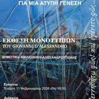 Η Δημοτική Βιβλιοθήκη Αλεξανδρούπολης θα φιλοξενήσει την έκθεση του διακεκριμένου καλλιτέχνη Giovanni D'Alessandro. Τα εγκαίνια θα πραγματοποιηθούν την Τετάρτη 11 Φεβρουαρίου στις 18.00, σηματοδοτώντας την έναρξη μιας εικαστικής διαδρομής που φέρνει το κοινό της πόλης σε επαφή με την...