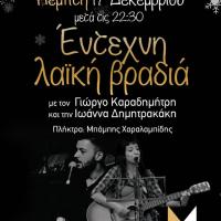 Την Πέμπτη 17 Δεκεμβρίου μετά τις 22.30 μια έντεχνη λαϊκή βραδιά μας έχει ετοιμάσει το Κυβερνείο. Με τον Γιώργο Καραδημήτρη, την Ιωάννα Δημητρακάκη και τον Μπάμπη Χαραλαμπίδη στα πλήκτρα η βραδιά της Πέμπτης αναμένεται καταπληκτική. Με πολύ τραγούδι, χορό...