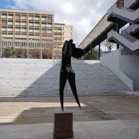 Ένα μοντέρνο γλυπτό της Νίκης της Σαμοθράκης κοσμεί τον προαύλιο χώρο της βιβλιοθήκης της Φιλοσοφικής Σχολής Αθηνών