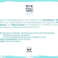 Την Παρασκευή 19 Μαΐου 2023 στις 20:30, στο Δημοτικό Θέατρο Αλεξανδρούπολης, θα πραγματοποιηθεί η παρουσίαση του φωτογραφικού λευκώματος «Η στέγη της μνήμης» του Μίμη Δούκα, στο πλαίσιο των Ελευθέριων 2023. // Ομιλητές: Νικόλαος Πινάτζης «Ιστορία - Αρχιτεκτονική - Φωτογραφία» Θεόδωρος Αγγλιάς, Δικηγόρος «Η παλιά...