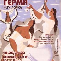 Η Πειραματική Σκηνή Αλεξανδρούπολης σε συνεργασία με την Κινηματογραφική Λέσχη Αλεξανδρούπολης , παρουσιάζει στις 19,20,21 και 22 Ιουνίου 2016 και ώρα 9:30 μ.μ στο Σινέ Φλοίσβος: Πλάζ Ε.Ο.Τ. τo θεατρικό έργο του Φ. Γκ. Λόρκα «Γέρμα»...