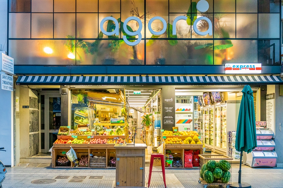 El. Venizelou Caddesi 45'te, KTEL otobüs durağının karşısında bulunan Agora adlı tema market, şehrin kalbinde yer alan bir alışveriş noktasıdır. Agora, "Mr. Grand" ve FC ürünlerini bulabileceğiniz Masoutis express marketleri ile tam işbirliği içindedir.